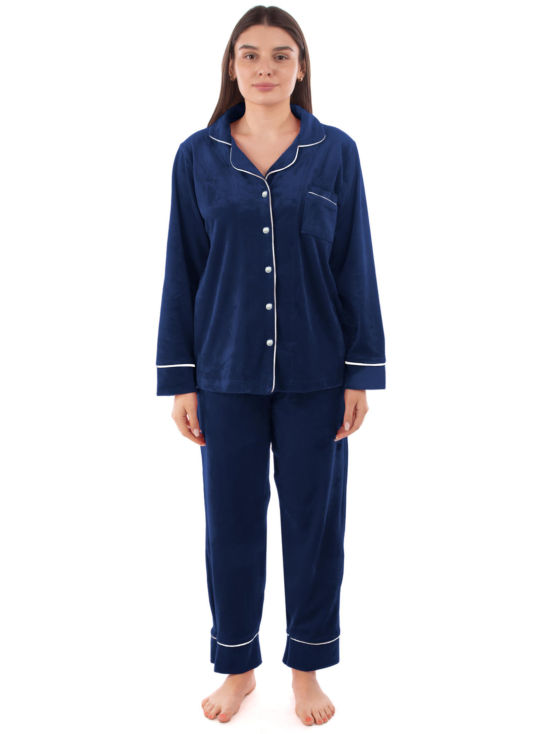 Pyjama set, long-sleeved shirt and pants. The shirt is defined by a black satin and buttons down the front.