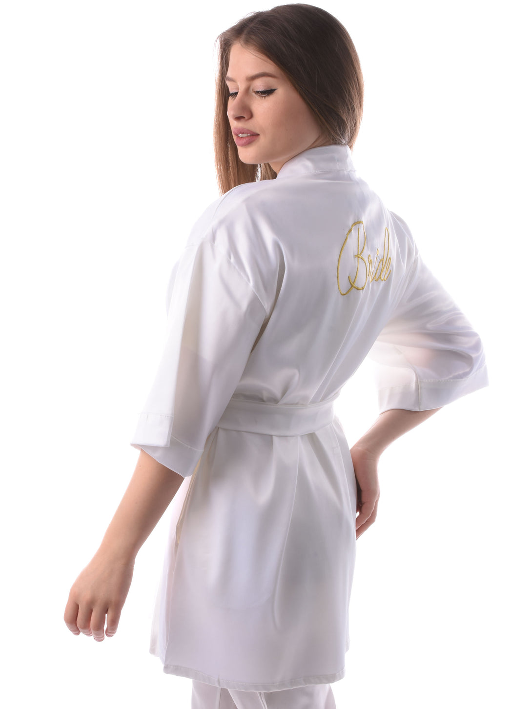 White Satin Short Kimono Robe For Brides , Embroidered Word "Bride" on the Back with Two Side Pockets and Satin Belt