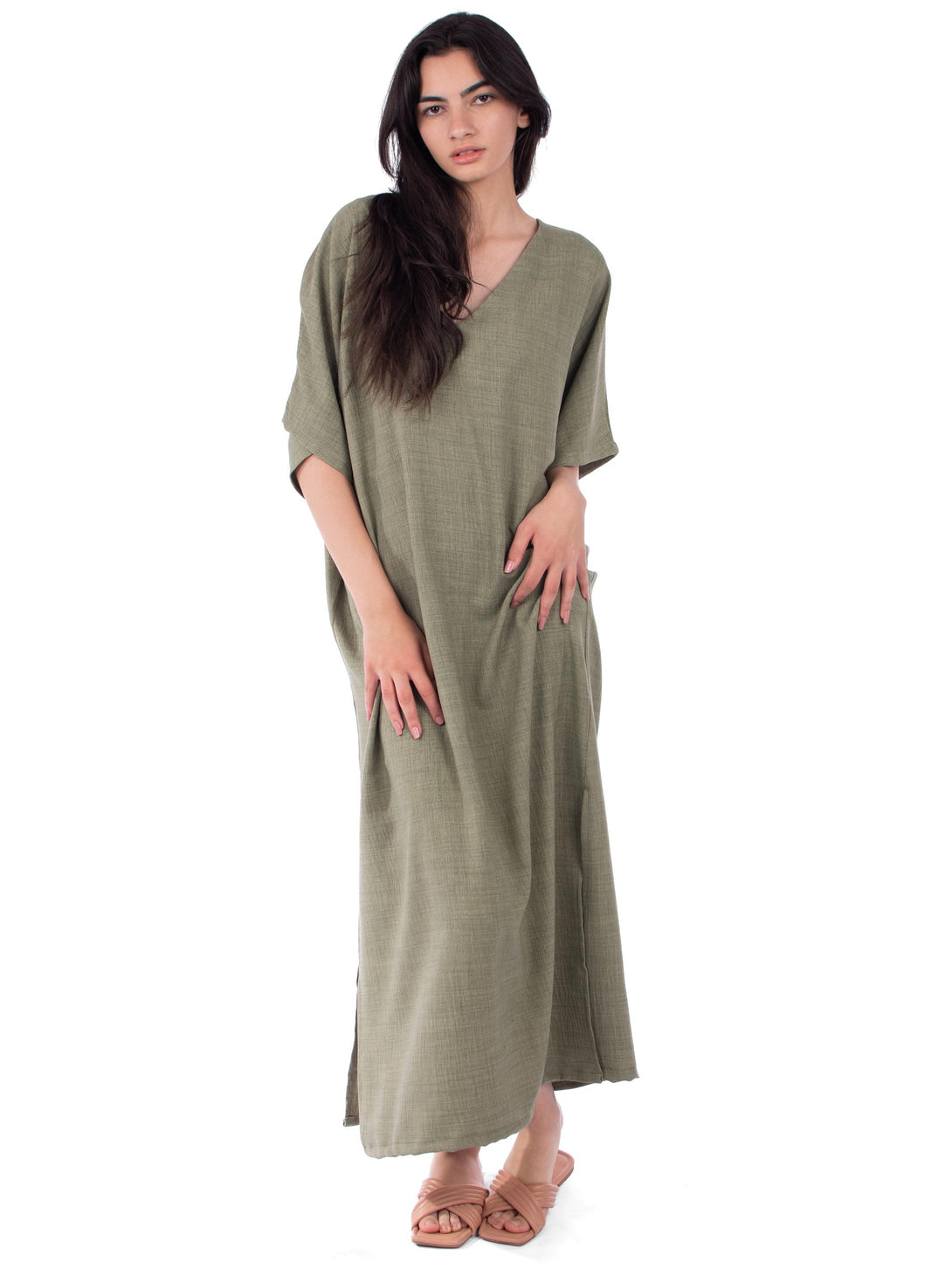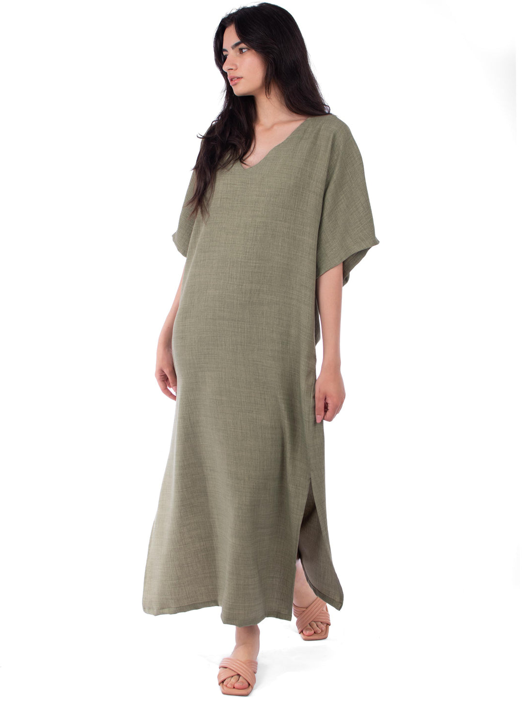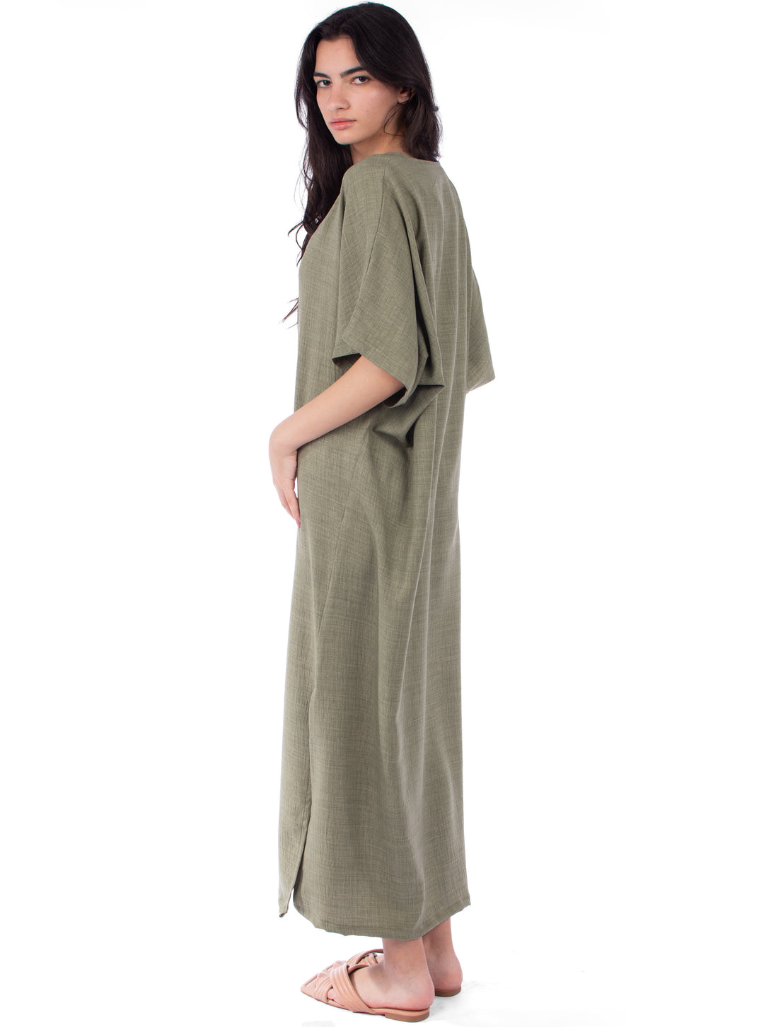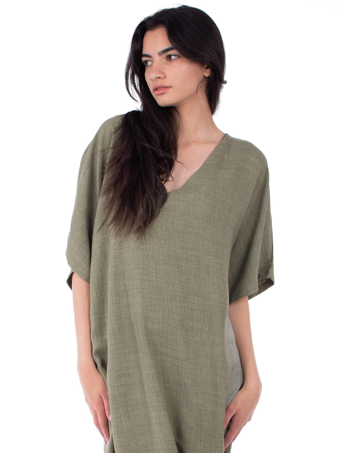 Short-sleeved tunic dress with V-neck. Side slits. Stone details on the neckline.