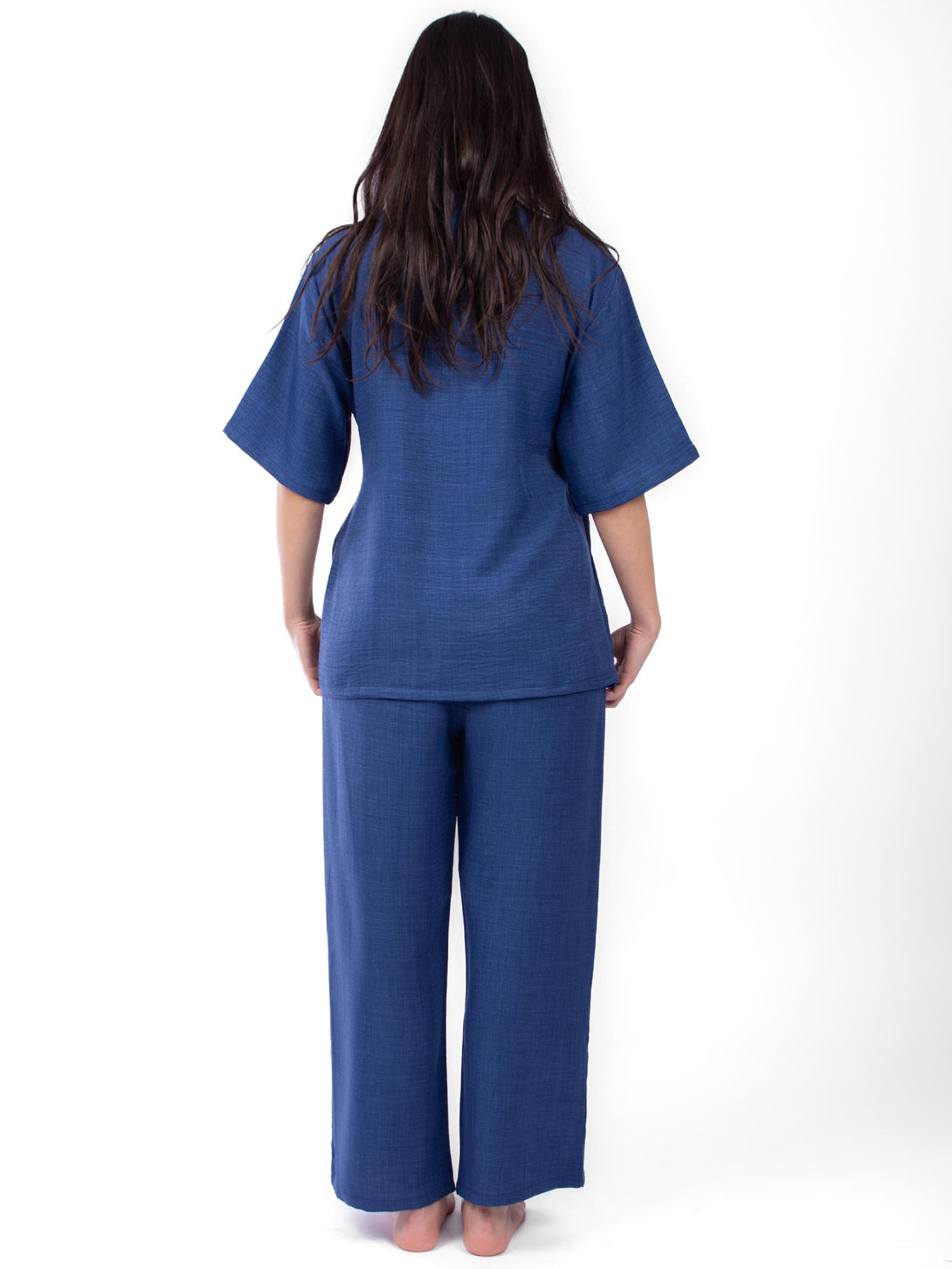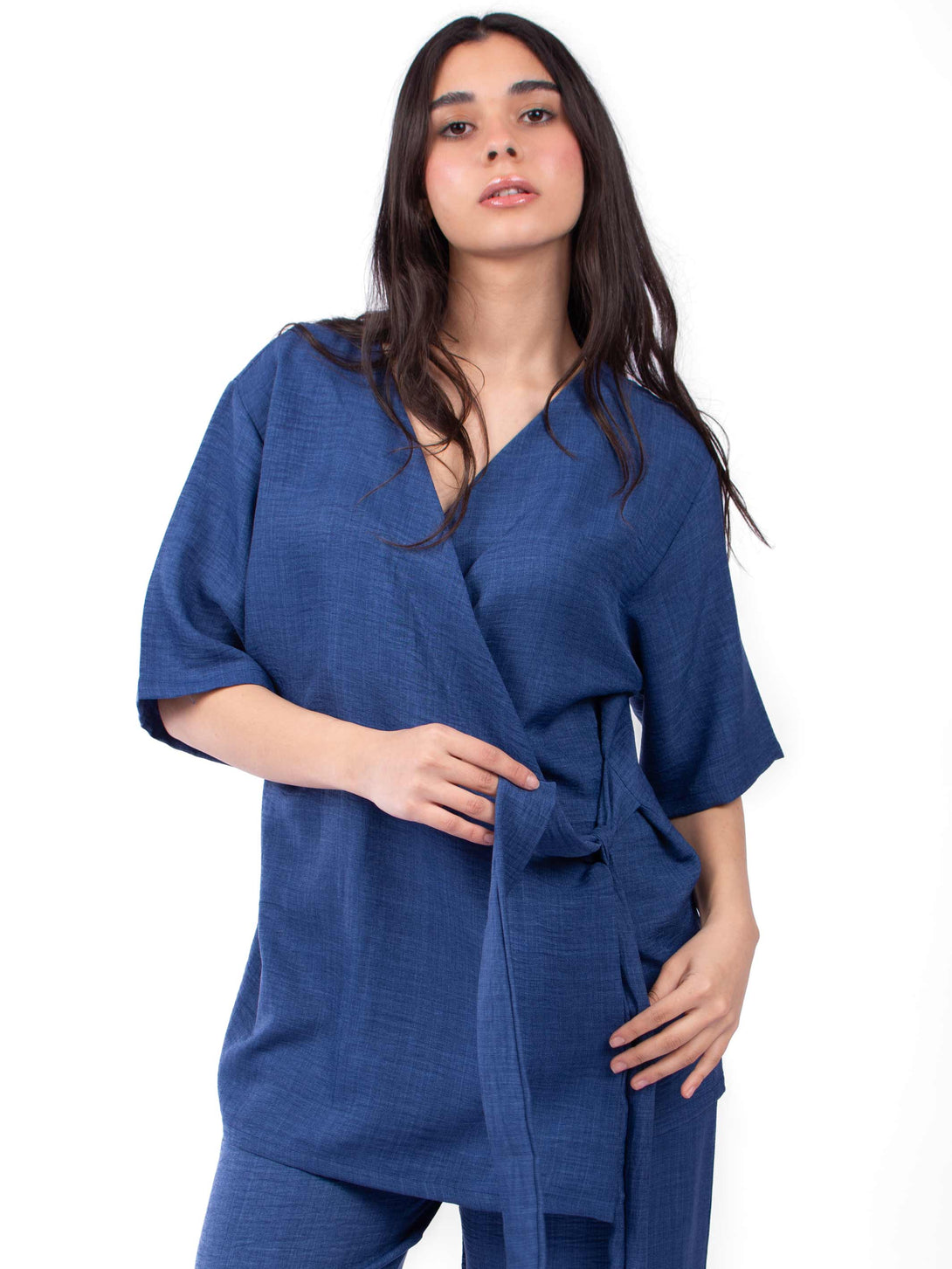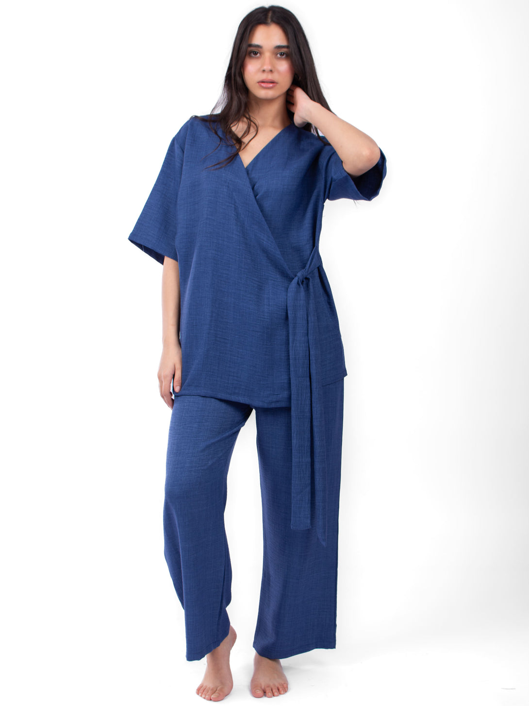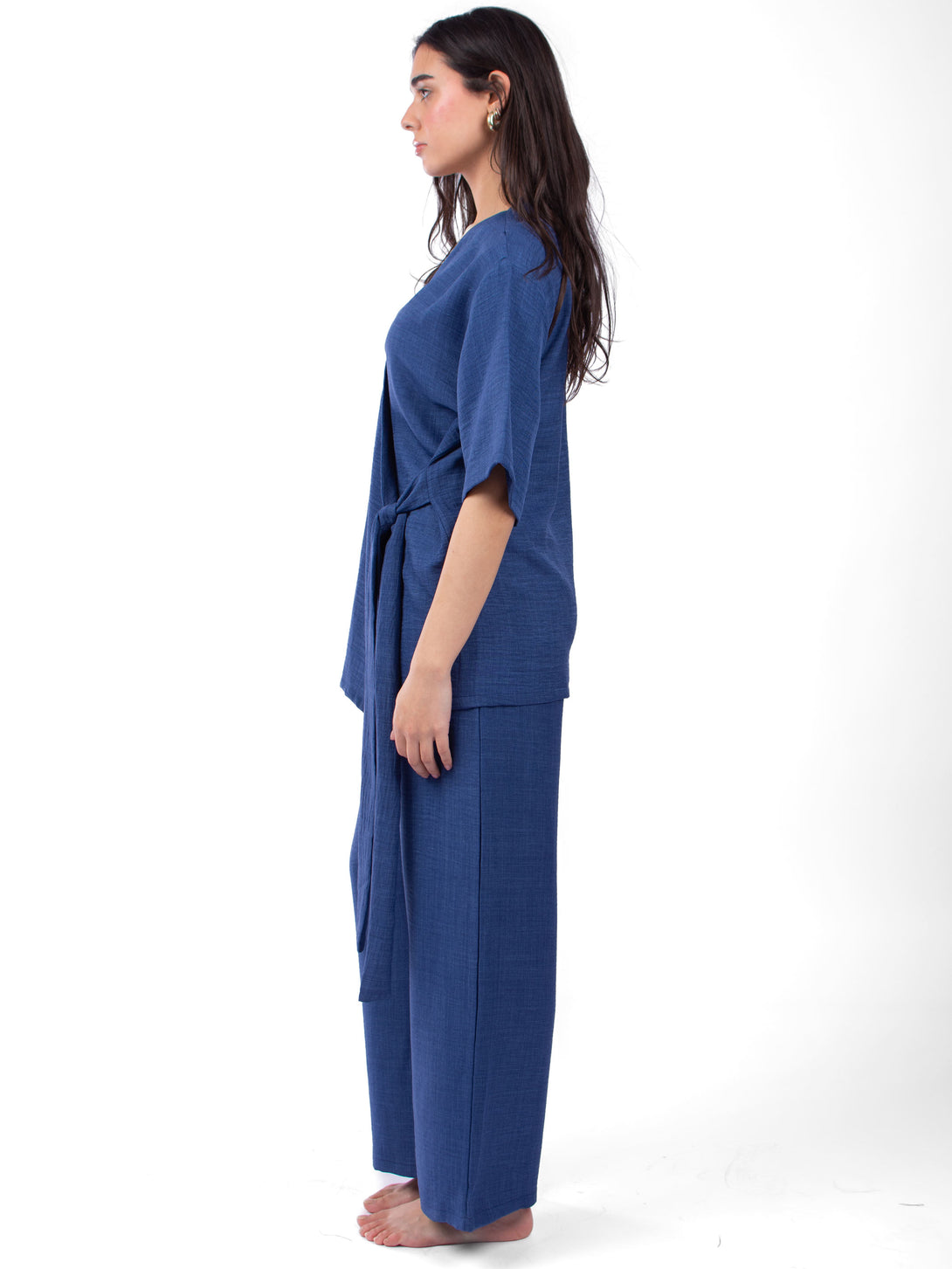 Double-breasted linen-like fabric, a set of Jacket and a tie belt at the waist with Bottoms with an elasticated waist and wide straight legs.