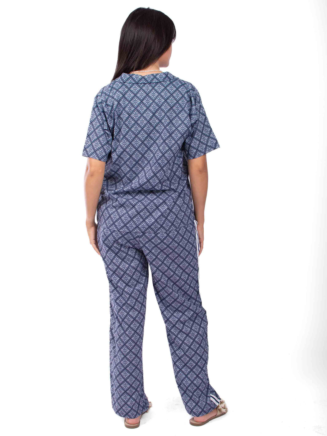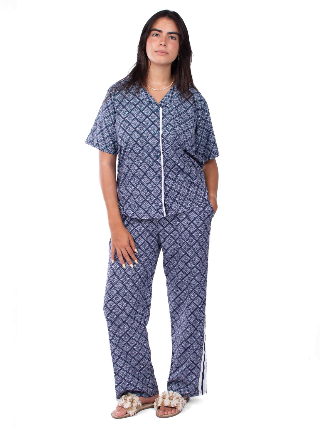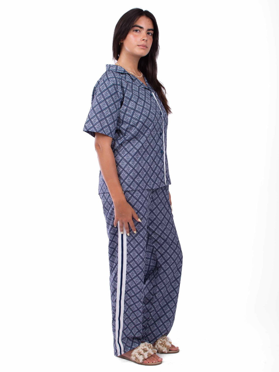 Pyjama Set, a Shirt with V-neckline and buttons down the front, chest pocket. Bottoms with an elasticated waist and straight legs.